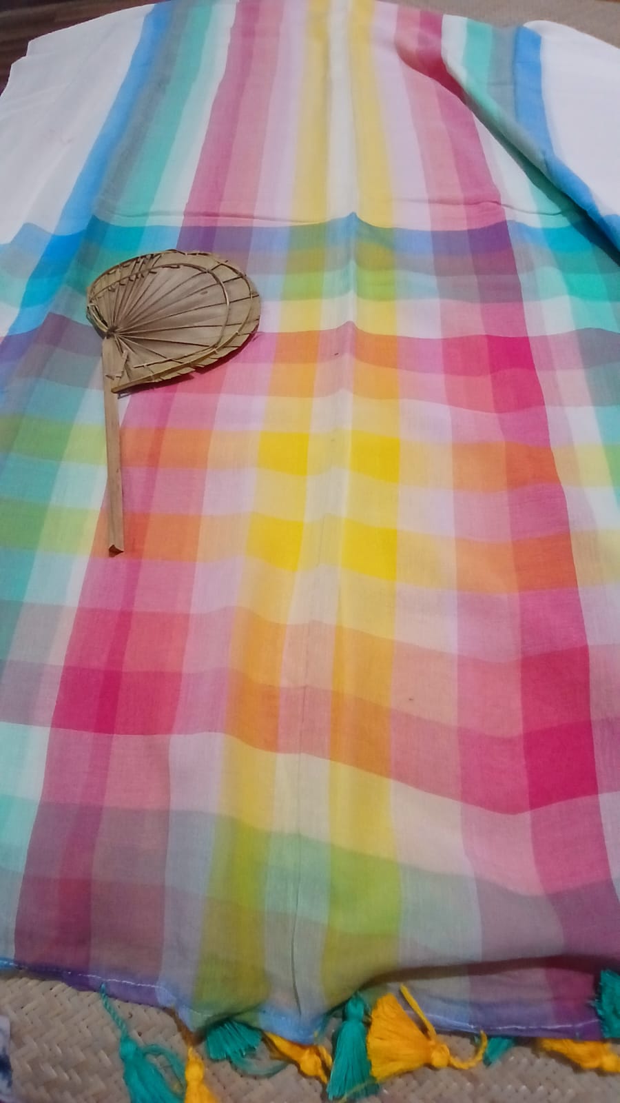 Mul cotton white colour with middle portion rainbow stripe and checks in pallu portion